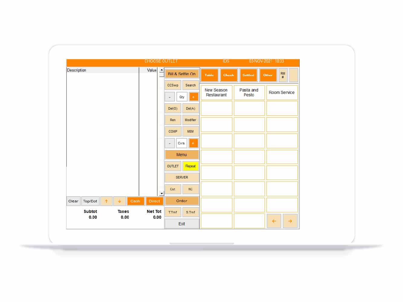 Touch POS, regular, and FX Fine Dine GUI for order generation and billing