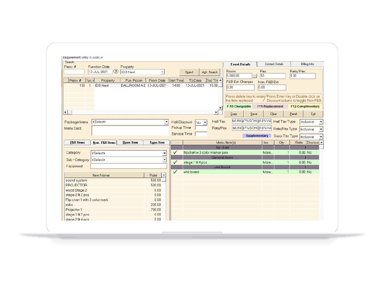This module captures event information, the flow of events, set-up styles, and payment terms, eliminating the need for the staff to engage in tedious repetitive tasks. The F&B services can also be integrated, enabling rate/pax amount calculations. This module has its own billing and settlement supported by split bills and split amount functions.