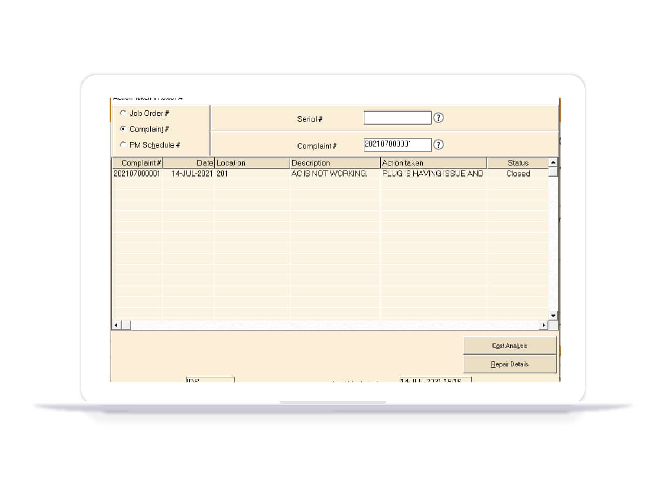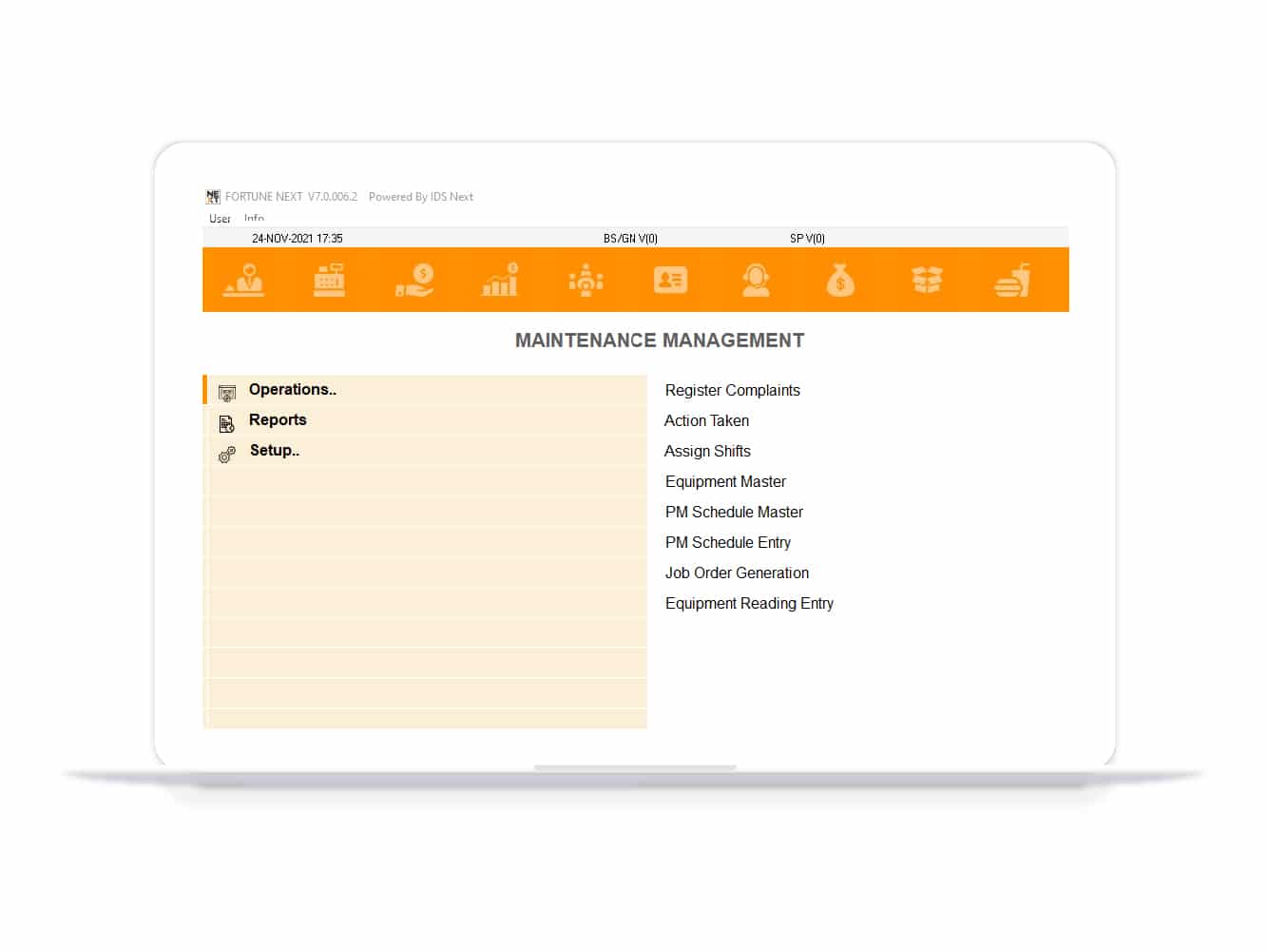 FortuneNext Maintenance Management module consists of an equipment master and details on preventive maintenance. Consolidating maintenance-related queries, all the complaints are registered within the module and jobs assigned as per the complaints. It enables monitoring complaints, their status and the action taken for the same.