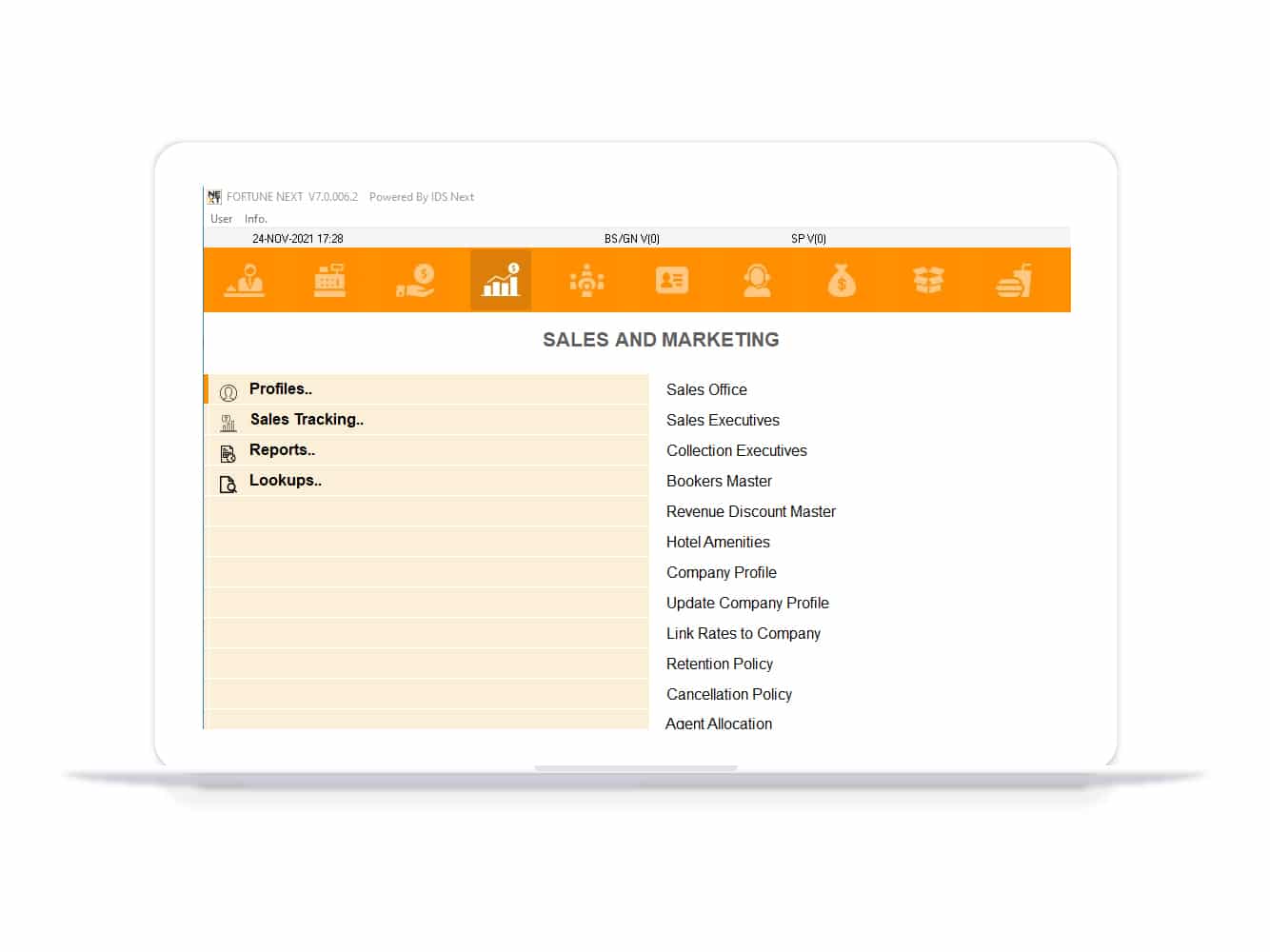 This module defines company profiles and manages corporates with whom the hotel maintains interactions. It provides corporate MIS on revenues, room nights, ARR, and comparisons with the budget. Sales and Marketing also records and keeps track of daily sales and instant reports on daily revenue.