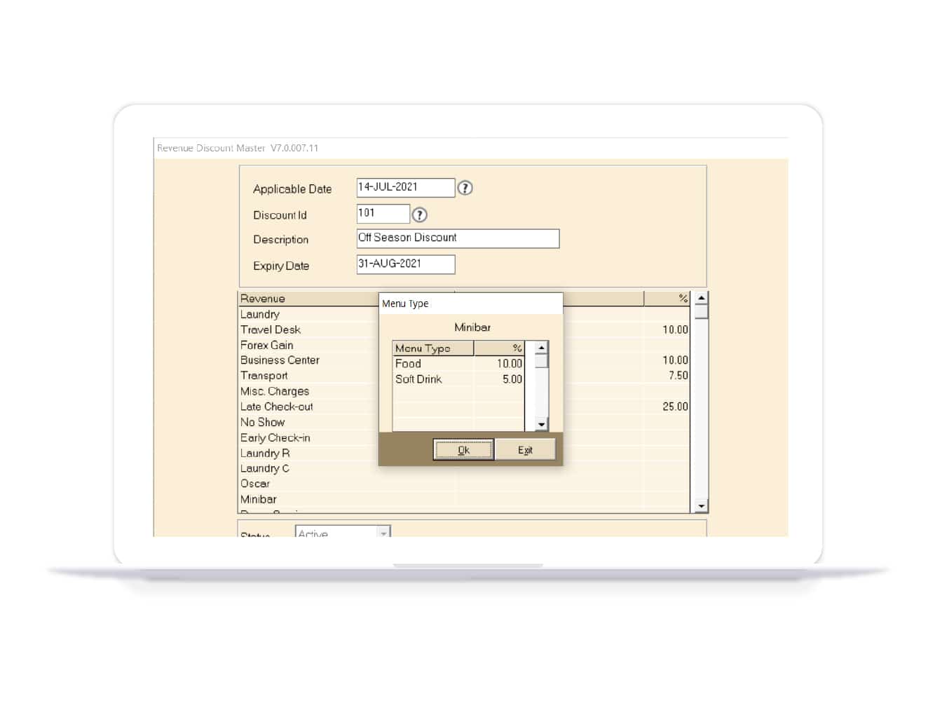 Through this option, all revenues will be populated in the grid to which various discount percentages can be tagged. The information added here is customisable and editable, with facilities to assign validations as applicable. Discount percentages tagged here will be applicable during bill generation in F&B outlets and various transaction entries.