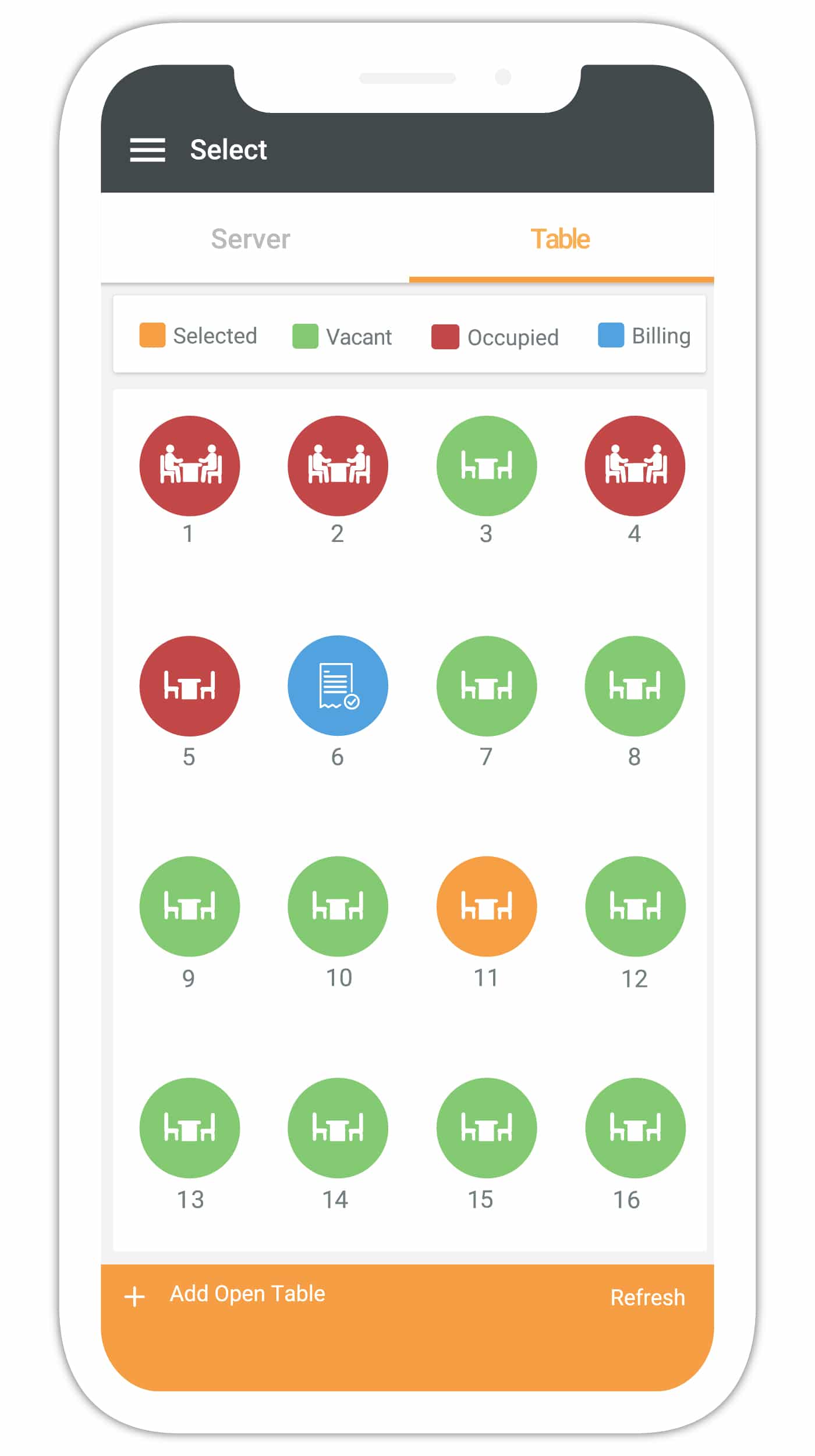 View real-time table status for all tables across the outlet on a single screen. The visual layout is colour coded for ease of reference.